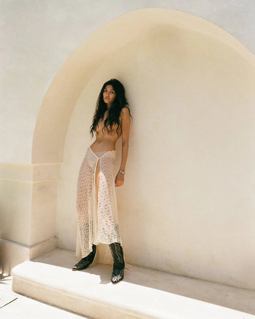 Turn heads and make a statement with our Naked Skirt. This transparent lace skirt in cream is for the bold and daring, designed to blend elegance with an edgy twist. Featuring a high slit cut, it adds a touch of drama and movement to your look. Perfect for layering over a swimsuit or pairing with your favorite top, this skirt is your go-to for standing out in any crowd.